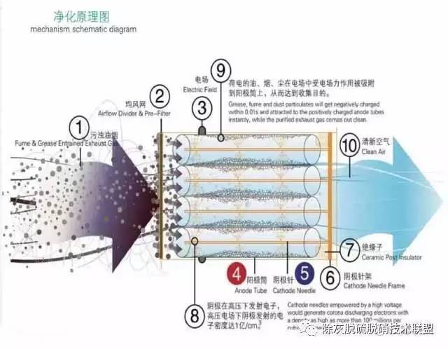 煙氣通過電除塵器主體結構前的煙道時,使其煙塵帶正電荷,然后煙氣進入設置多層陰極板的電除塵器通道,由于帶正電荷煙塵與陰極電板的相互吸附作用,使煙氣中的顆粒煙塵吸附在陰極上,定時打擊陰極板,使具有一定厚度的煙塵在自重和振動的雙重作用下跌落在電除塵器結構下方的灰斗中,從而達到清除煙氣中的煙塵的目的。
