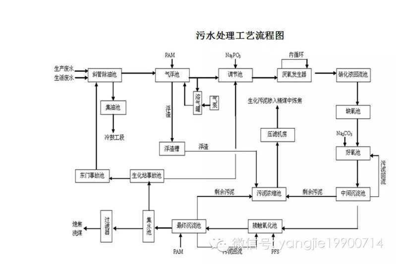 在洗苯、脫苯的操作過程中,循環(huán)洗油的質(zhì)量逐漸惡化,為保證洗油質(zhì)量,采用洗油再生器將部分洗油再生。 污廢水處理工藝流程:(A2/O2)
