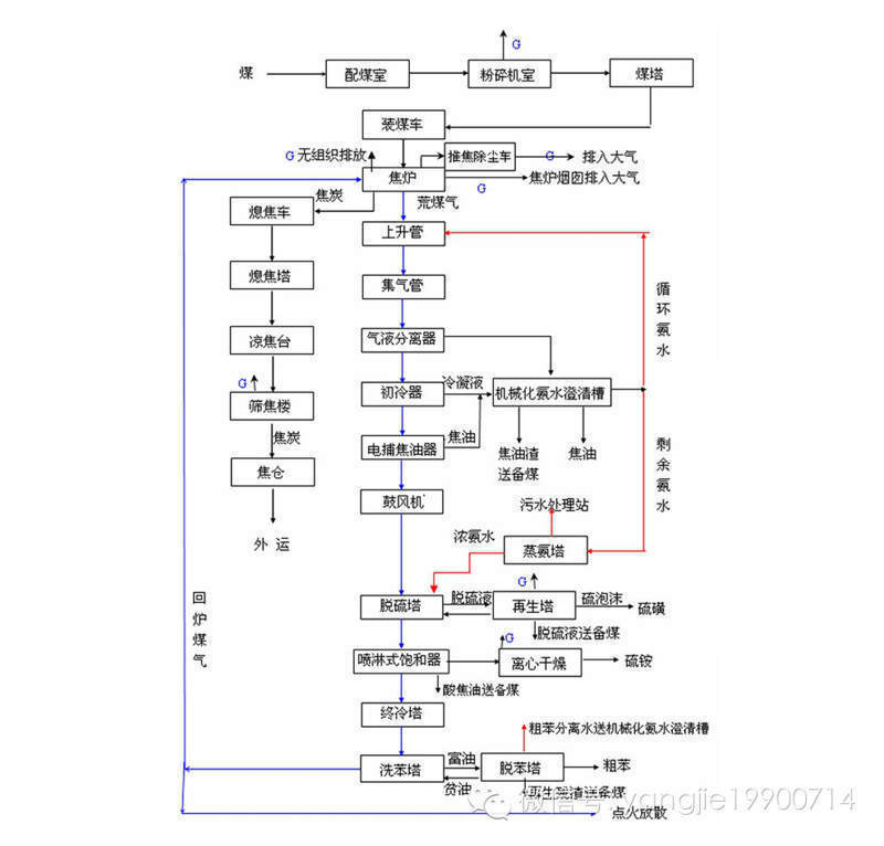 焦?fàn)t加熱燃用的凈化煤氣經(jīng)預(yù)熱器預(yù)熱至45℃左右進(jìn)入地下室,通過下噴管把煤氣送入燃燒室立火道,燃燒后的廢氣經(jīng)煙道、煙囪排入大氣。