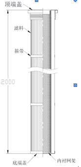 濾筒內部采用金屬網圓筒形內襯支撐,上、下分別與頂端蓋和底端蓋連接。濾料的外側布置一定數量的包箍帶,保證褶型濾料在噴吹清灰時不發生變形。濾料為硬挺水刺濾料。