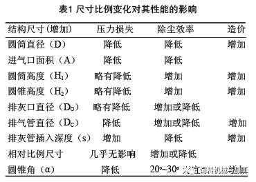 旋風除塵器的各個部件都有一定的尺寸比例,每一個比例關系的變動,都能影響旋風除塵器的效率和壓力損失。其中除塵器直徑、進氣口尺寸、排氣管直徑為主要影響因素。它們的變化對除塵器性能的影響關系見表1。在使用時應注意,表1中所示的尺寸只能在一定范圍內進行調整,當超過某一界限時,有利因素也能轉化為不利因素。另外,有的因素對于提高除塵效率有利,但卻會增加壓力損失,因而對因素的調整必須兼顧。