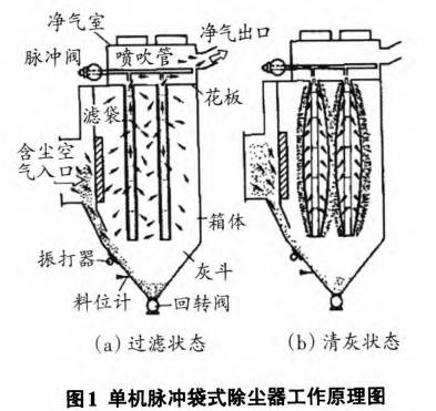 單機脈沖袋式除塵器的主要組成有:箱體部分 (花板、濾袋、骨架)、灰斗部分(灰斗、檢查門)、排灰機構(翻板閥、分隔輪,常見為翻板閥)、進出風管道、脈沖清灰裝置(氣包、電磁閥、脈沖閥、噴吹管道)、壓縮氣源和風機,其除塵原理見圖1。